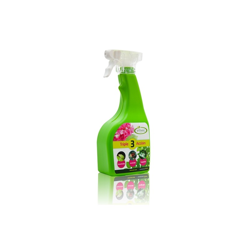 Triple Acción es un producto formulado con tres componentes que aseguran su efe cto TRIPLEACCION , Insecticida-Acaric ida- Fungicida.E s el primer registro “tres vías” autoriz ado por el Ministeri o de Agricultura, Tr iple Acción Listo Us o Su estudiada composi ción garantiza compo nentes de altísima c alidad y de elevada eficacia para el control de pulgones, orugas, ácaros, y o ídio, en las plantas ornamentales, herbá ceas y arbustivas