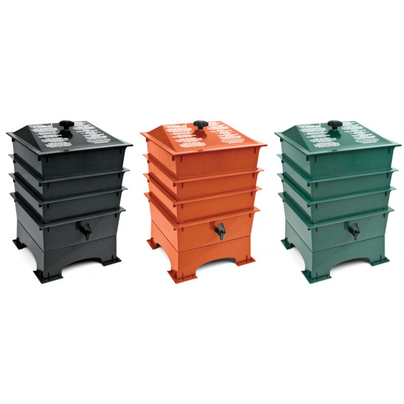 Este vermicompostero está diseñado para que quede todo recogido y limpio, sin olores y con un sistema que evita que las lombrices escapen. Además del humus de lombriz sólido, este sistema permite obtener humus de lombriz líquido conocido como Black Gold (oro negro) entre los jardineros.