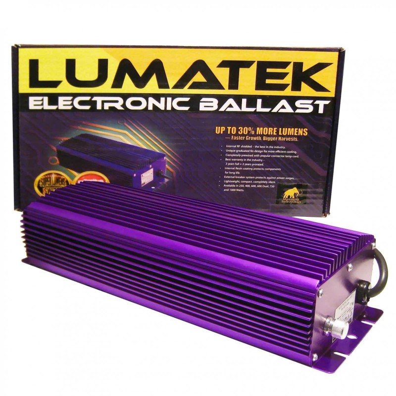 Los balastros digitales Lumatek son la solución iluminaria más avanzada para la horticultura moderna.Pequeño, compacto y completamente silencioso. Estos balastros electrónicos son capaces de ofrecer más lúmenes mientras utilizan menos electricidad que los balastros magnéticos convencionales.A diferencia del 'núcleo y bobina' tradicional de los balastros magnéticos, los balastros electrónicos Lumatek son controlados por microprocesador y pueden evaluar y compensar el estado real de las fluctuaciones de degradación de la lámpara y de tensión en la fuente de alimentación.