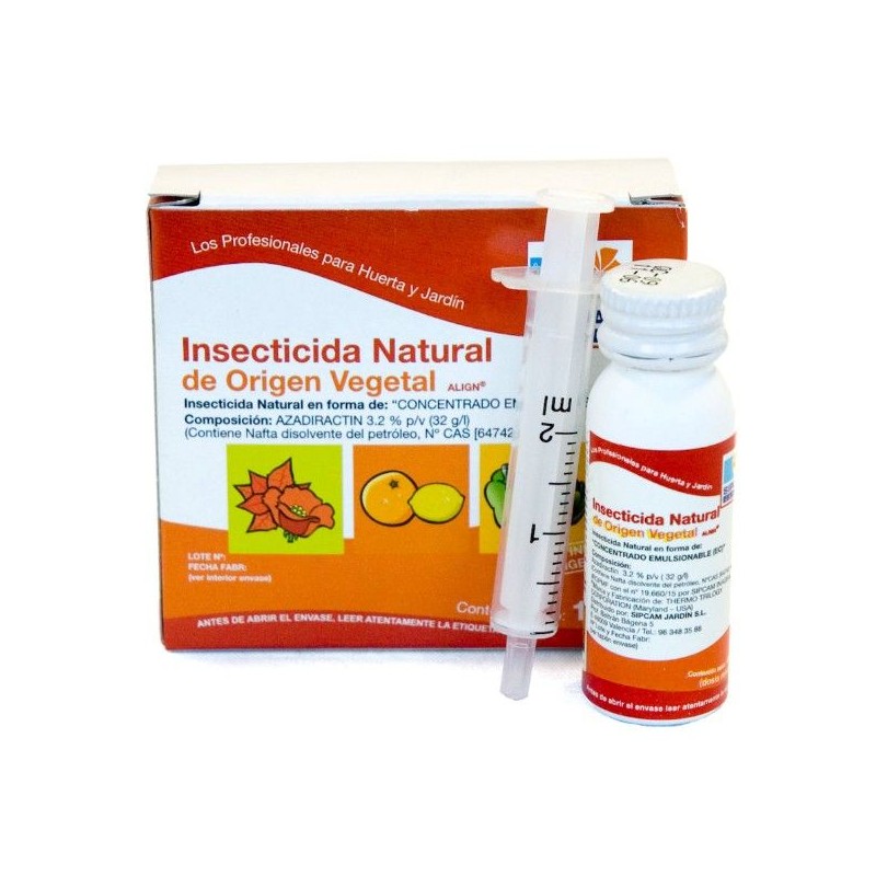 Está compuesto por azadiractin 3.2% (32gr/lt) y controla minadores de las hojas, mosca blanca, rosquillas, trips, orugas, polillas, pulgones, ácaros, cochinillas, mosquito verde, etc. El envase contiene 15ml de extracto de Neem y es suficiente para una mochila de 15 litros.