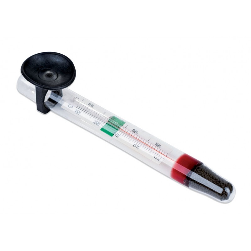 Termómetro de mercurio que incorpora una ventosa para sujetarlo a la pared del depósito de alimentación.