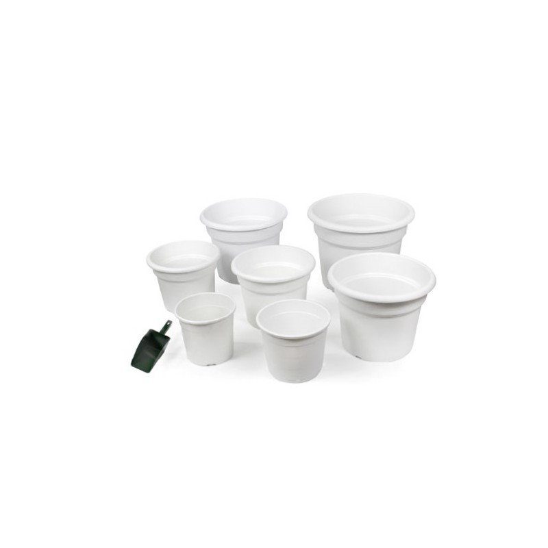 Maceta contenedor de plastico inyectado que ofrece mayor resistencia a la radiacion y a la temperatura por estar fabricadas en plastico blanco.